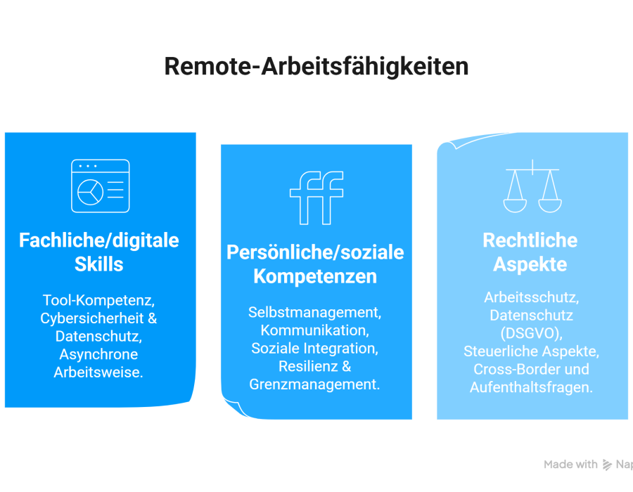 Remote Work bringt klare rechtliche Pflichten und steuerliche Besonderheiten. Drei zentrale Bereiche sind besonders relevant: Arbeitsschutz, Datenschutz (DSGVO) und steuerliche Regelungen.