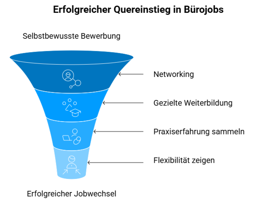 - Interne Wechsel: Wer bereits in einem Unternehmen arbeitet, kann sich auf interne Stellen im Bürobereich bewerben und so den Quereinstieg wagen.